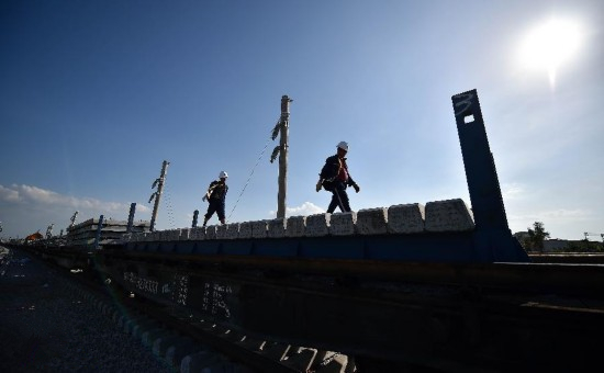 6月30日,铺轨车在进行西环铁路最后一段钢轨铺设。当日,海南西环铁路全线铺轨正式完成,与东环铁路完成闭环,标志着海南环岛高铁正式贯通。海南西环铁路建成通车后,岛内铁路沿线任意两市县间将实现3小时内通达,形成海岛“三小时经济圈”。